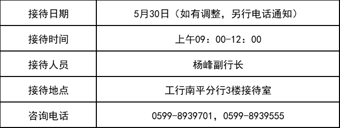 中國工商銀行南平分行2025年5月“行長接待日”公告